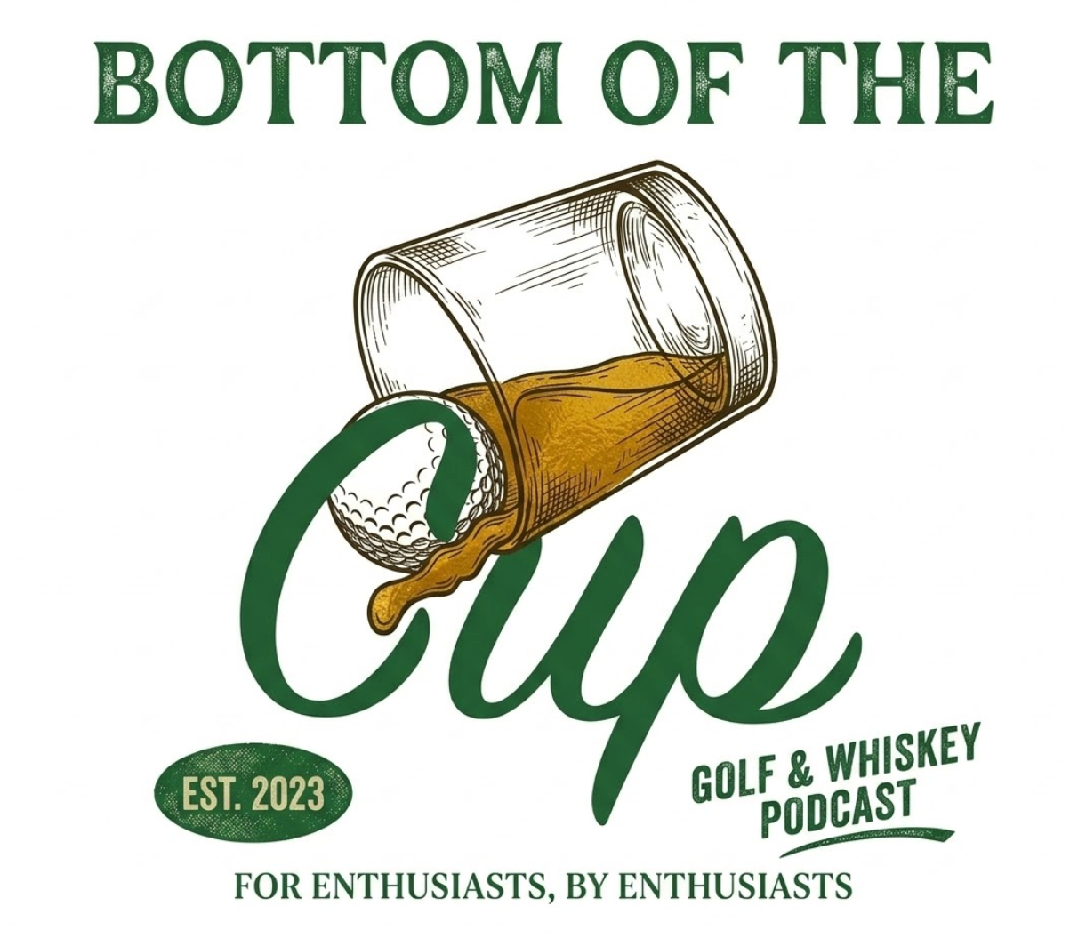The concept combines the two themes of the podcast—golf and whiskey—by showing a tipped whiskey glass pouring out a golf ball. The green color palette reflects the look of a golf course, while the typography and illustration style give the design a classic feel that matches the whiskey theme.